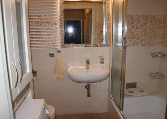 - ❓Que comodidades de casa de banho podemos esperar encontrar em Apartament "Ryszard" 2 Sypialnie, Balkon, Widok?Apartament "Ryszard" 2 Sypialnie, Balkon, Widok possui uma casa de banho completa com secador de cabelo, lençóis de banho e toalhas.
